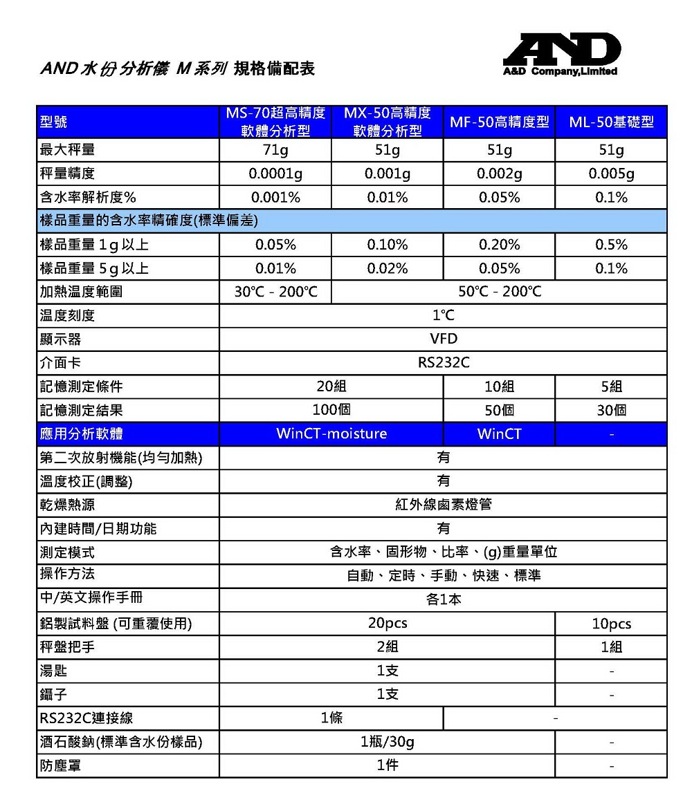 AND MS-70/MX-50/MF-50/ML-50 水份分析儀